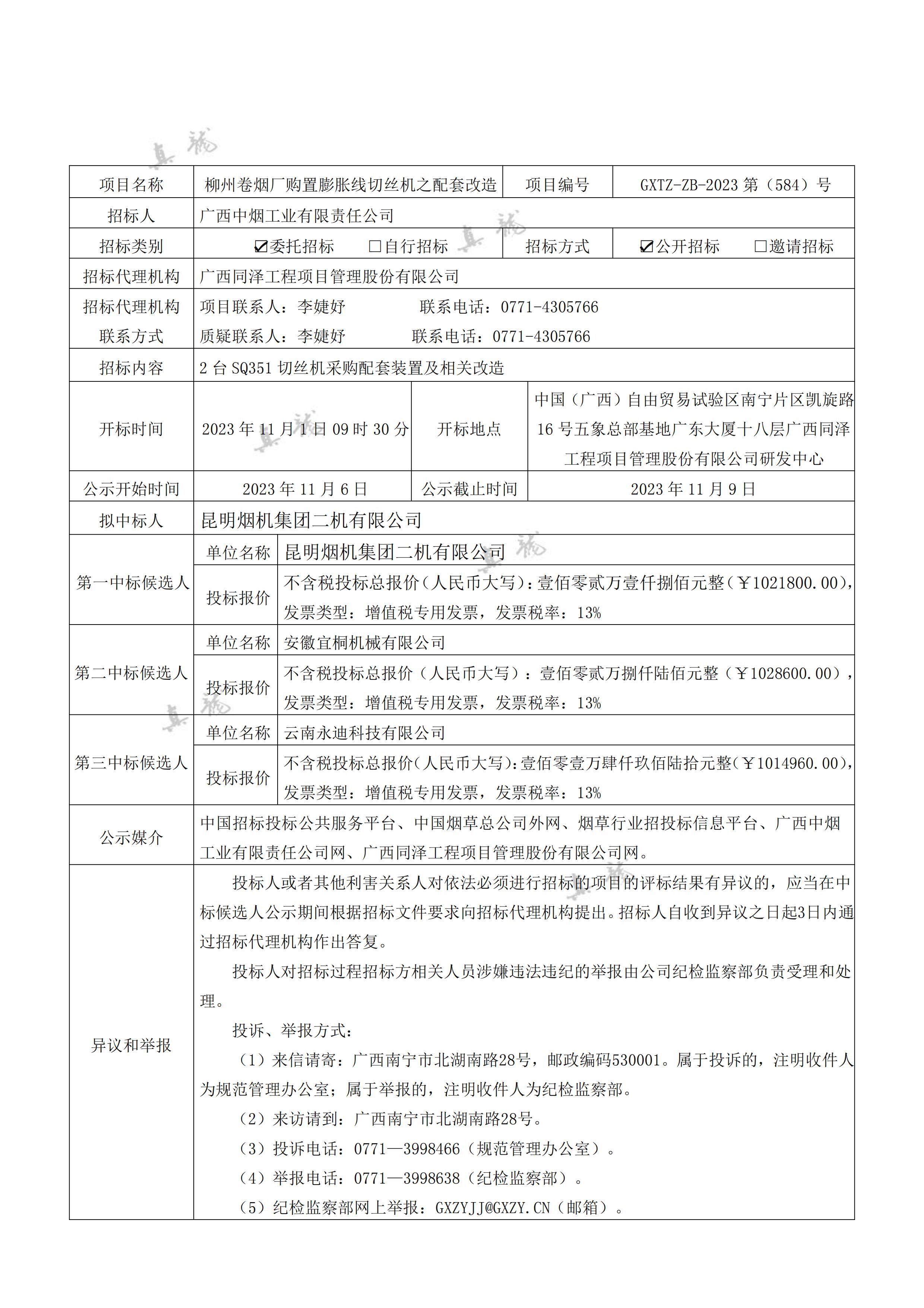 廣西中煙工業(yè)有限責任公司柳州卷煙廠購置膨脹線切絲機之配套改造(項目編號:GXTZ-ZB-2023第(584)號)中標候選人公示