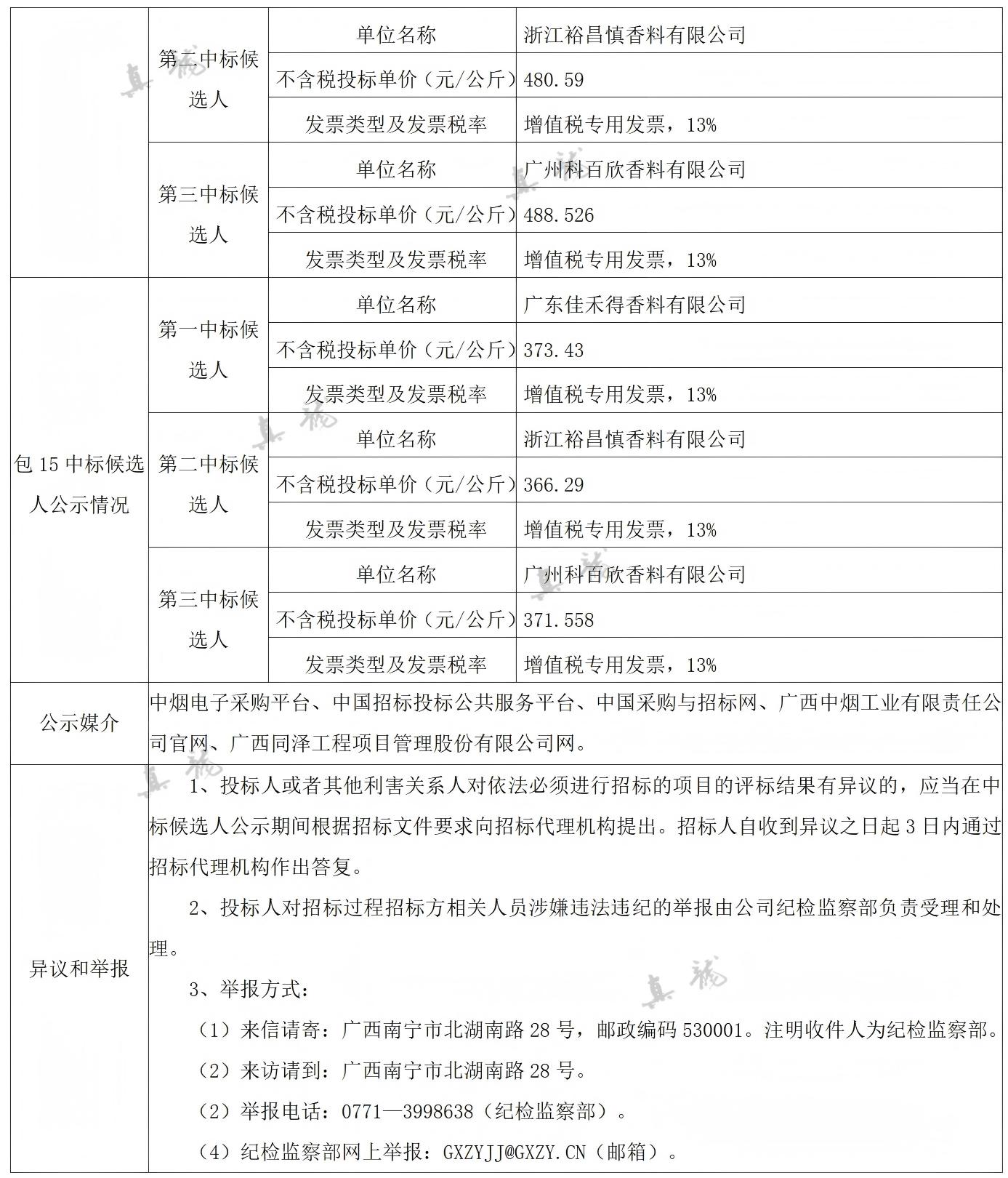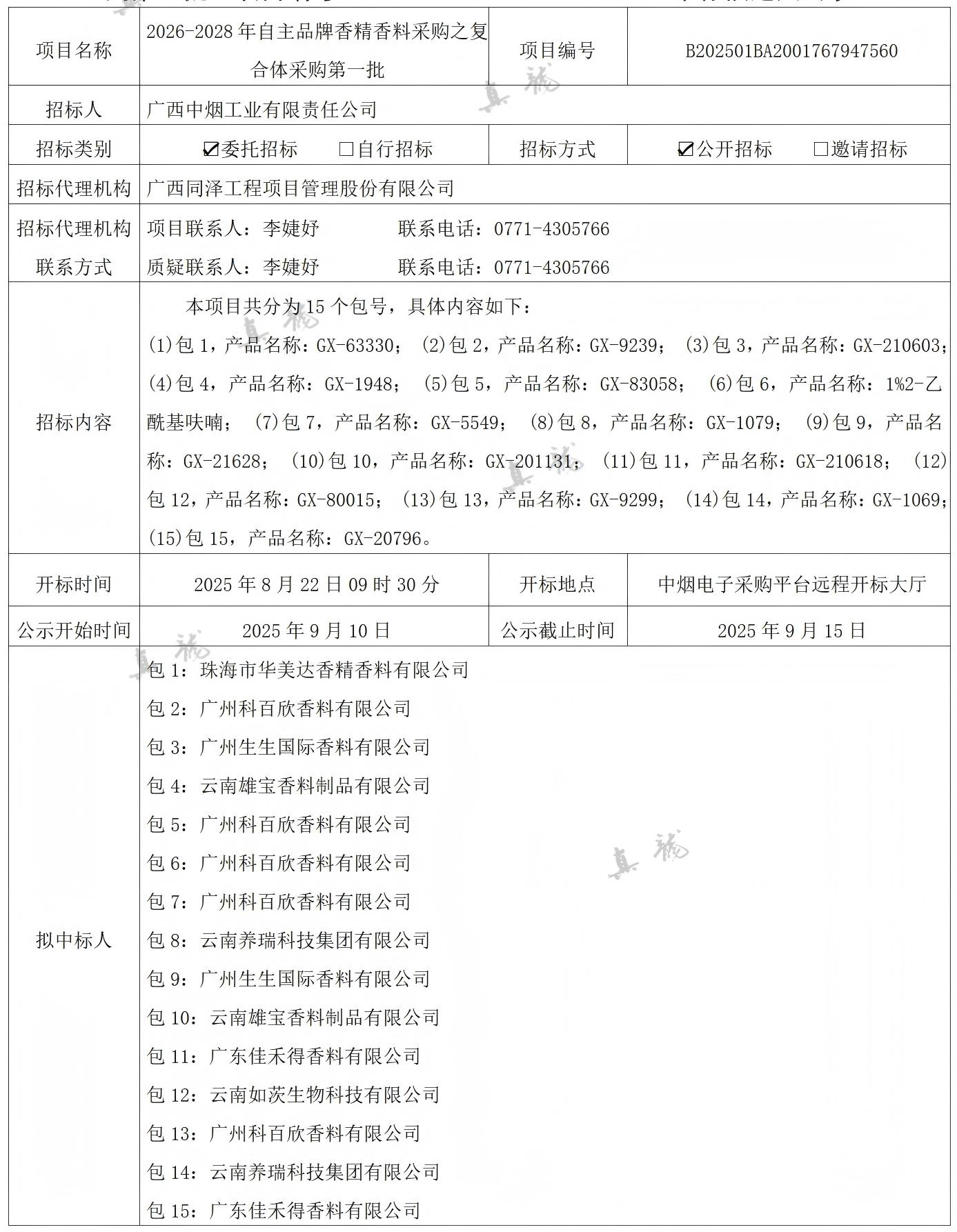 廣西中煙工業(yè)有限責任公司2026-2028年自主品牌香精香料采購之復(fù)合體采購第一批(項目編號:B202501BA2001767947560)中標候選人公示